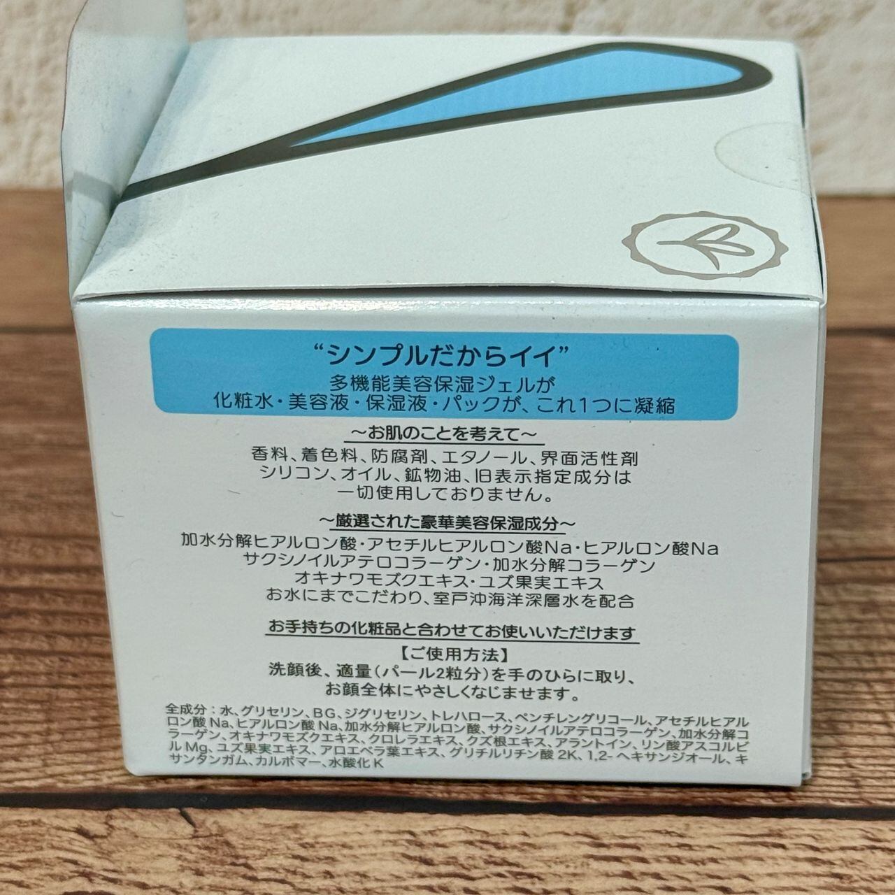 水、グリセリン、BG、ジグリセリン、トレハロース、ペンチレングリコール、アセチルヒアルロン酸Na、ヒアルロン酸Na、加水分解ヒアルロン酸、サクシノイルアテロコラーゲン、加水分解コラーゲン、オキナワモズクエキス、クロレラエキス、クズ根エキス、アラントイン、リン酸アスコルビルMg、ユズ果実エキス、アロエベラ葉エキス、グリチルリチン酸2K、1,2-ヘキサンジオール、キサンタンガム、カルボマー、水酸化K
