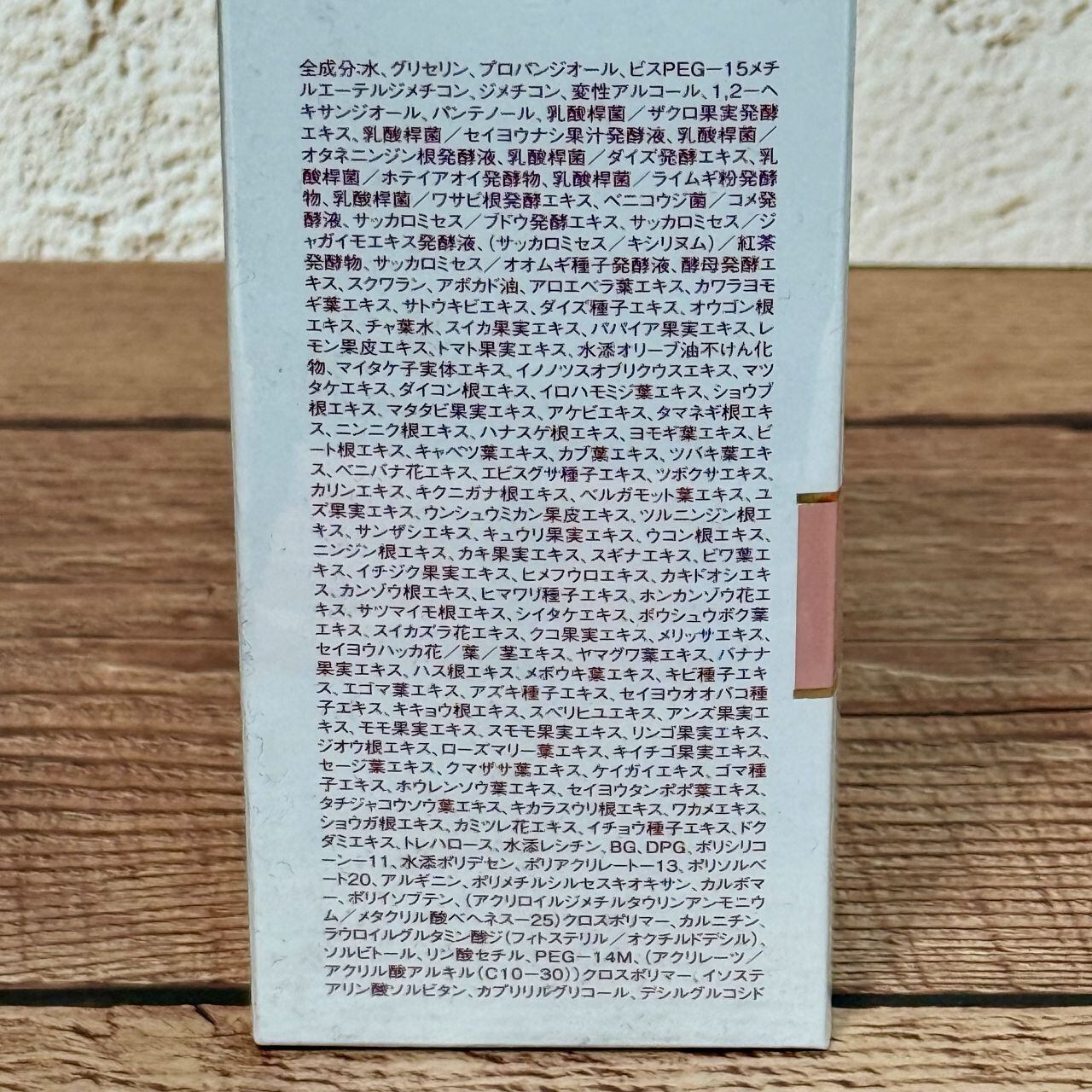 水、グリセリン、プロパンジオール、ビスPEG−15メチルエーテルジメチコン、ジメチコン、変性アルコール、 1,2−ヘキサンジオール、パンテノール、乳酸桿菌/ザクロ果実発酵エキス、乳酸桿菌/セイヨウナシ果汁発酵液、 乳酸桿菌/オタネニンジン根発酵液、乳酸桿菌/ダイズ発酵エキス、乳酸桿菌/ホテイアオイ発酵物、 乳酸桿菌/ライムギ粉発酵物、酸桿菌/ワサビ根発酵エキス、ベニコウジ菌/コメ発酵液、サッカロミセス/ブドウ発酵エキス、 サッカロミセス/ジャガイモエキス発酵液、(サッカロミセス/キシリヌム)/紅茶発酵物、サッカロミセス/オオムギ種子発酵液、 酵母発酵エキス、スクワラン、アボカド油、アロエベラ葉エキス、カワラヨモギ葉エキス、サトウキビエキス、ダイズ種子エキス、 オウゴン根エキス、チャ葉水、スイカ果実エキス、パパイア果実エキス、レモン果皮エキス、トマト果実エキス、 水添オリーブ油不けん化物、マイタケ子実体エキス、イノノツスオブリクウスエキス、マツタケエキス、ダイコン根エキス、 イロハモミジ葉エキス、ショウブ根エキス、マタタビ果実エキス、アケビエキス、タマネギ根エキス、ニンニク根エキス、 ハナスゲ根エキス、ヨモギ葉エキス、ビート根エキス、キャベツ葉エキス、カブ葉エキス、ツバキ葉エキス、ベニバナ花エキス、 エビスグサ種子エキス、ツボクサエキス、カリンエキス、キクニガナ根エキス、ベルガモット葉エキス、ユズ果実エキス、 ウンシュウミカン果皮エキス、ツルニンジン根エキス、サンザシエキス、キュウリ果実エキス、ウコン根エキス、ニンジン根エキス、 カキ果実エキス、スギナエキス、ビワ葉エキス、イチジク果実エキス、ヒメフウロエキス、カキドオシエキス、カンゾウ根エキス、 ヒマワリ種子エキス、ホンカンゾウ花エキス、サツマイモ根エキス、シイタケエキス、ボウシュウボク葉エキス、スイカズラ花エキス、 クコ果実エキス、メリッサエキス、セイヨウハッカ花/葉/茎エキス、ヤマグワ葉エキス、バナナ果実エキス、ハス根エキス、 メボウキ葉エキス、キビ種子エキス、エゴマ葉エキス、アズキ種子エキス、セイヨウオオバコ種子エキス、キキョウ根エキス、 スベリヒユエキス、アンズ果実エキス、モモ果実エキス、スモモ果実エキス、リンゴ果実エキス、ジオウ根エキス、 ローズマリー葉エキス、キイチゴ果実エキス、セージ葉エキス、クマザサ葉エキス、ケイガイエキス、ゴマ種子エキス、 ホウレンソウ葉エキス、セイヨウタンポポ葉エキス、タチジャコウソウ葉エキス、キカラスウリ根エキス、ワカメエキス、 ショウガ根エキス、カミツレ花エキス、イチョウ種子エキス、ドクダミエキス、トレハロース、水添レシチン、BG、DPG、 ポリシリコーン−11、水添ポリデセン、ポリアクリレート−13、ポリソルベート20、アルギニン、ポリメチルシルセスキオキサン、 カルボマー、ポリイソブテン、(アクリロイルジメチルタウリンアンモニウム/メタクリル酸ベヘネス−25)クロスポリマー、 カルニチン、ラウロイルグルタミン酸ジ(フィトステリル/オクチルドデシル)、ソルビトール、リン酸セチル、 PEG−14M、(アクリレーツ/アクリル酸アルキル(C10−30))クロスポリマー、イソステアリン酸ソルビタン、 カプリリルグリコール、デシルグルコシド