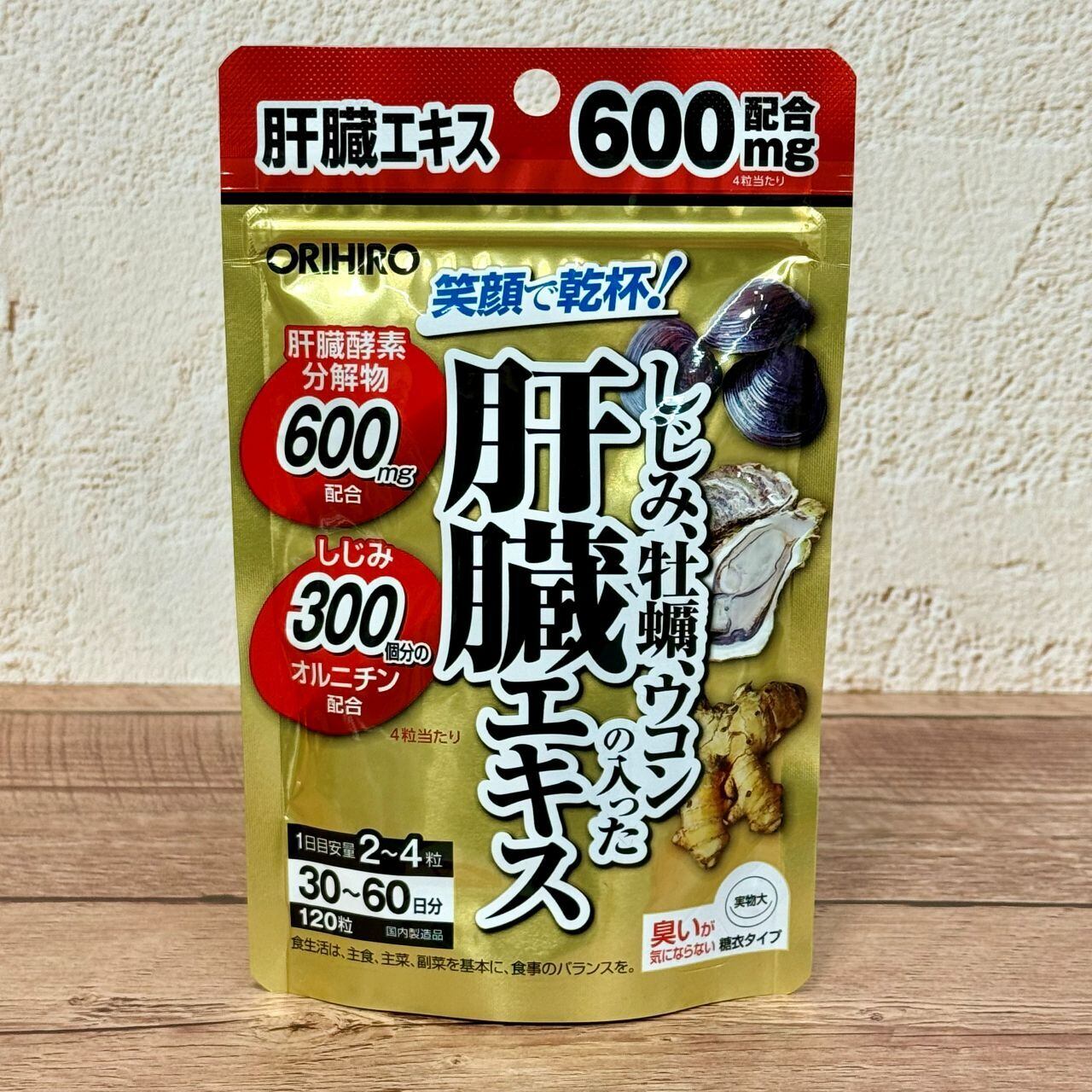肝臓酵素分解物600mg、しじみエキス末50mg、広島県産牡蠣肉濃縮エキス末40mg、秋ウコン濃縮エキス末40mg、クルクミン50mg、オルニチン120mg、イノシトール10mg、ビタミンB1 9.0mg、ビタミンB2 4.5mg、ビタミンB6 6.0mg、ビタミンB12 4.5μg、葉酸 250μg、亜鉛 2.0mg