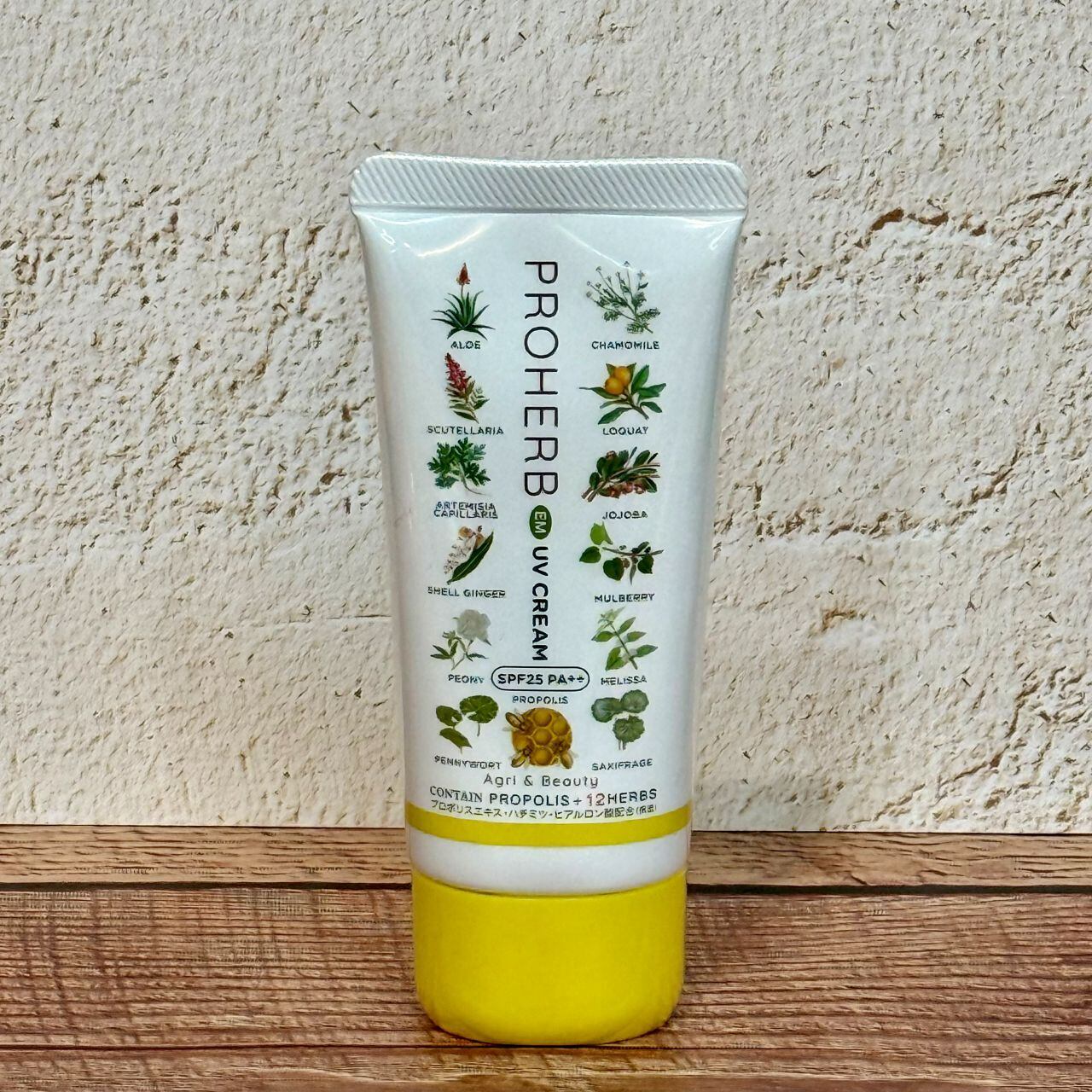 プロポリス+12種のハーブにCoQ10やハチミツ等を配合しました。SPF25、PA++