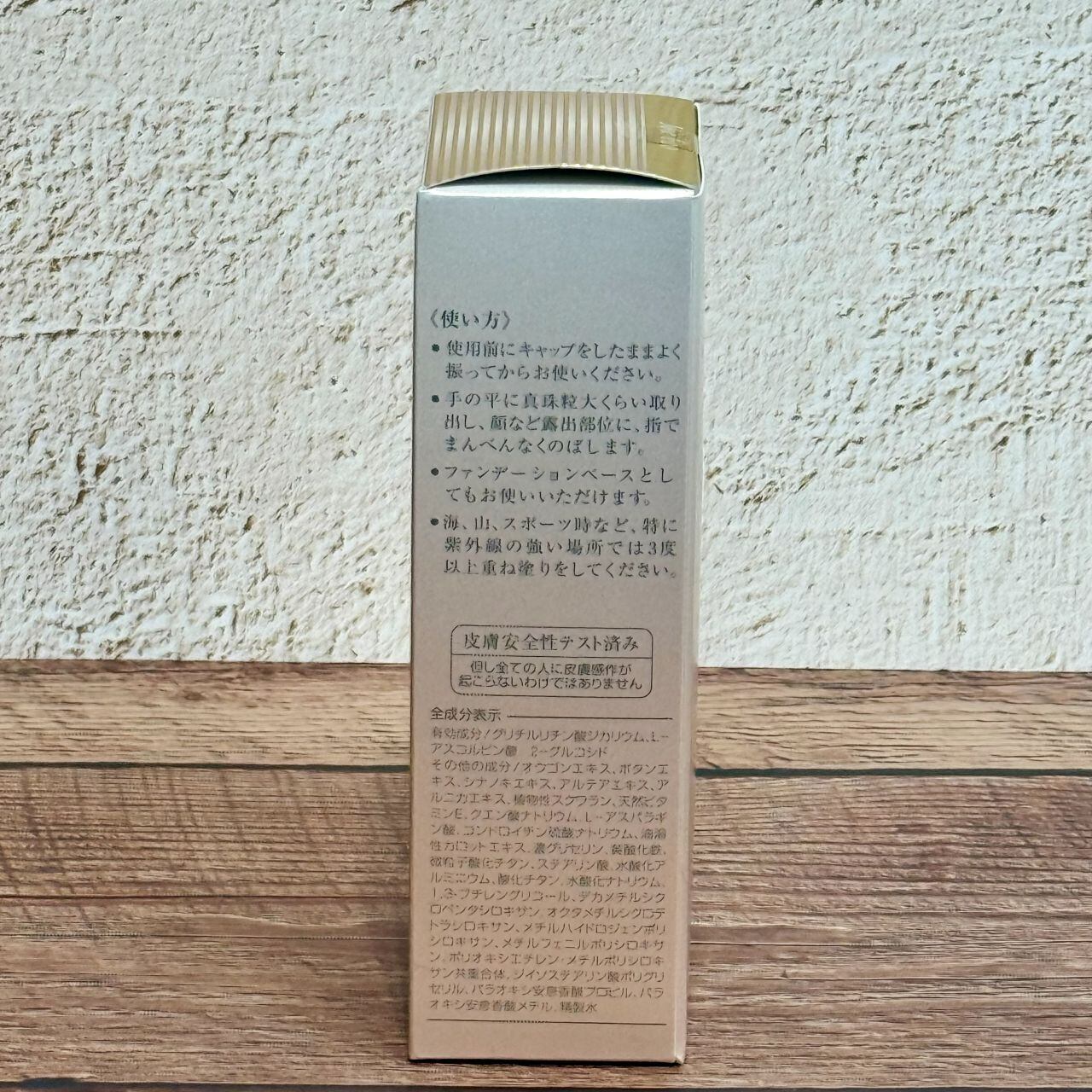 その他の成分/オウゴンエキス、ユズセラミド、ヒメフウロエキス、アルピニアカツマダイ種子エキス、チンピエキス、植物性スクワラン、天然ビタミンE、水素添加大豆リン脂質、フィトステロール、N-ステアロイルジヒドロスフィンゴシン、N-ステアロイルフィトスフィンゴシン、ヒドロキシステアリルフィトスフィンゴシン、マカデミアナッツ油脂肪酸フィトステリル、油溶性カロットエキス、ホホバ油、マカデミアナッツ油、濃グリセリン、クエン酸ナトリウム、水酸化ナトリウム、黄酸化鉄、微粒子酸化チタン、酸化チタン、水酸化アルミニウム、ステアリン酸、ヒドロキシアパタイト、縮合リシノレイン酸ポリグリセリル、モノイソステアリン酸ポリグリセリル、ジメチルジステアリルアンモニウムヘクトライト、1,3-ブチレングリコール、デカメチルシクロペンタシロキサン、メチルハイドロジェンポリシロキサン、メチルフェニルポリシロキサン、ポリオキシエチレン・メチルポリシロキサン共重合体、ジイソステアリン酸ポリグリセリル、パラオキシ安息香酸プロピル、パラオキシ安息香酸メチル、精製水