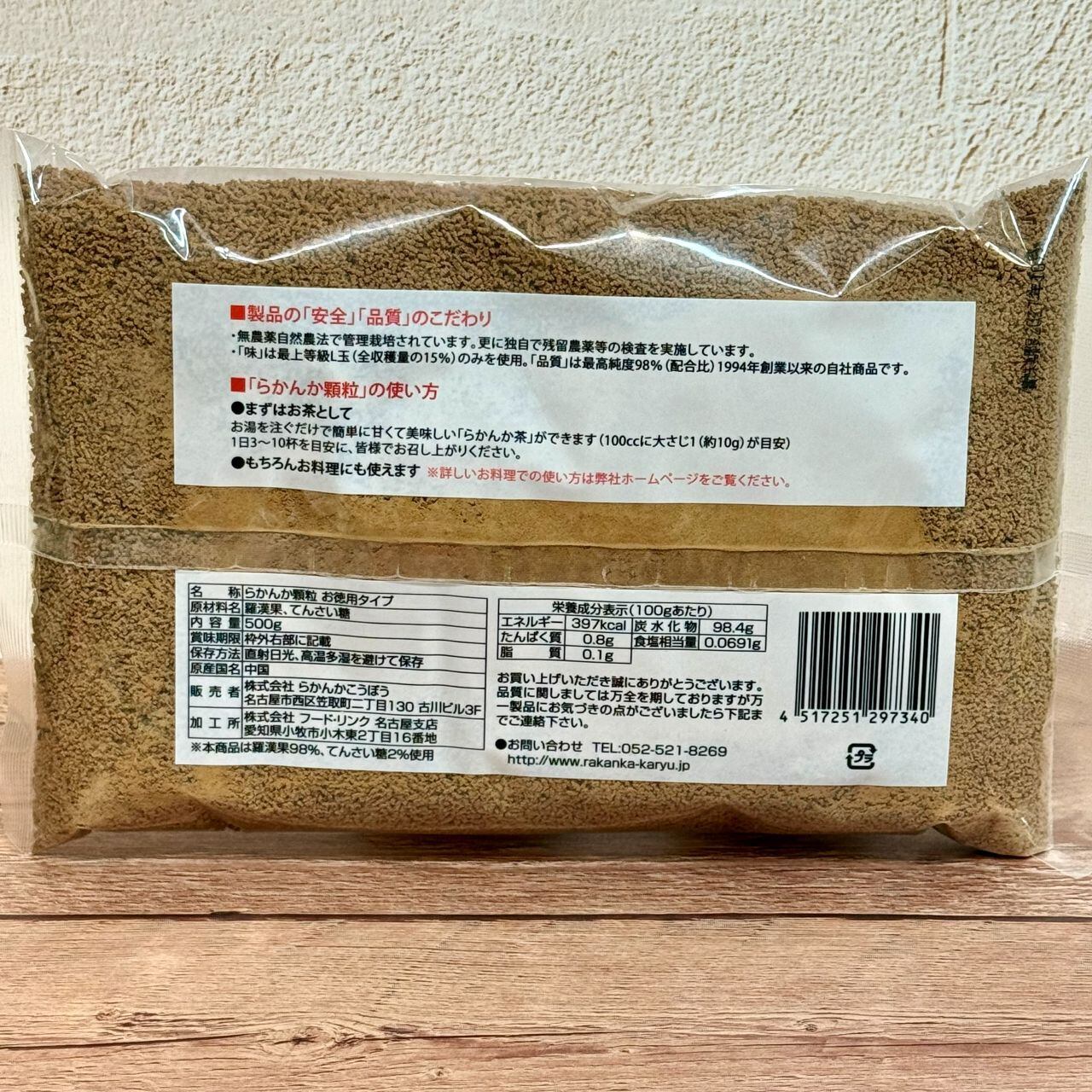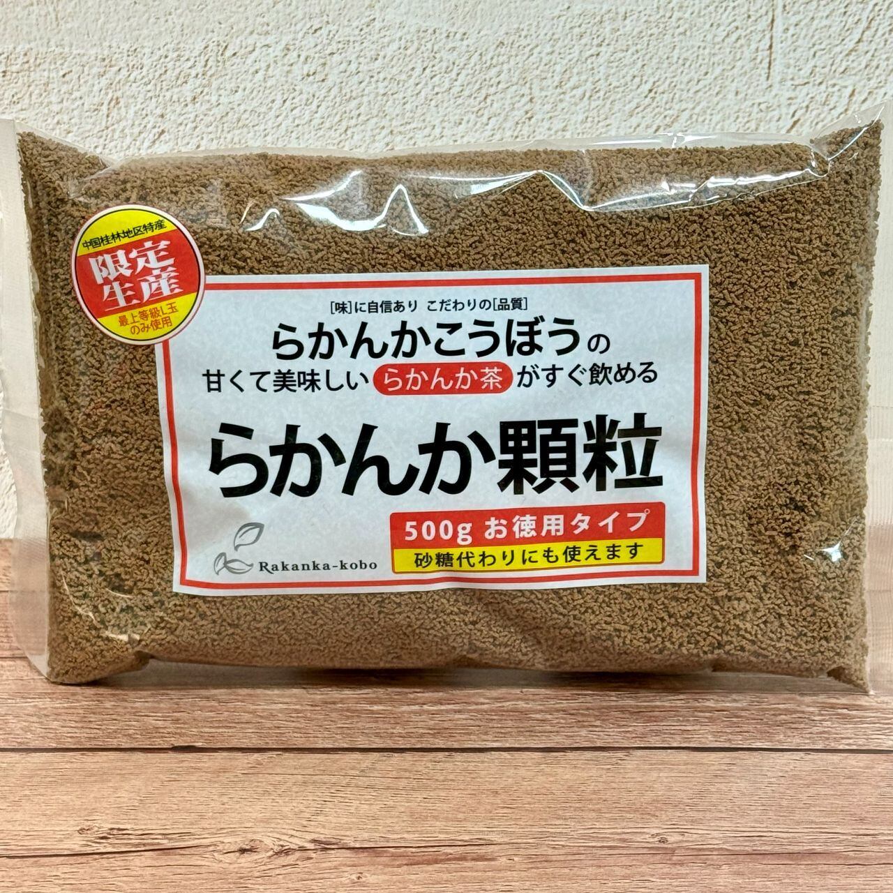 製法上の限界といわれる98%まで純度を高めた羅漢果顆粒。甘みは砂糖の約2倍、濃厚な甘味がありながらほとんどノンカロリー。お湯で溶かしただけの羅漢果茶も美味。徳用500g。