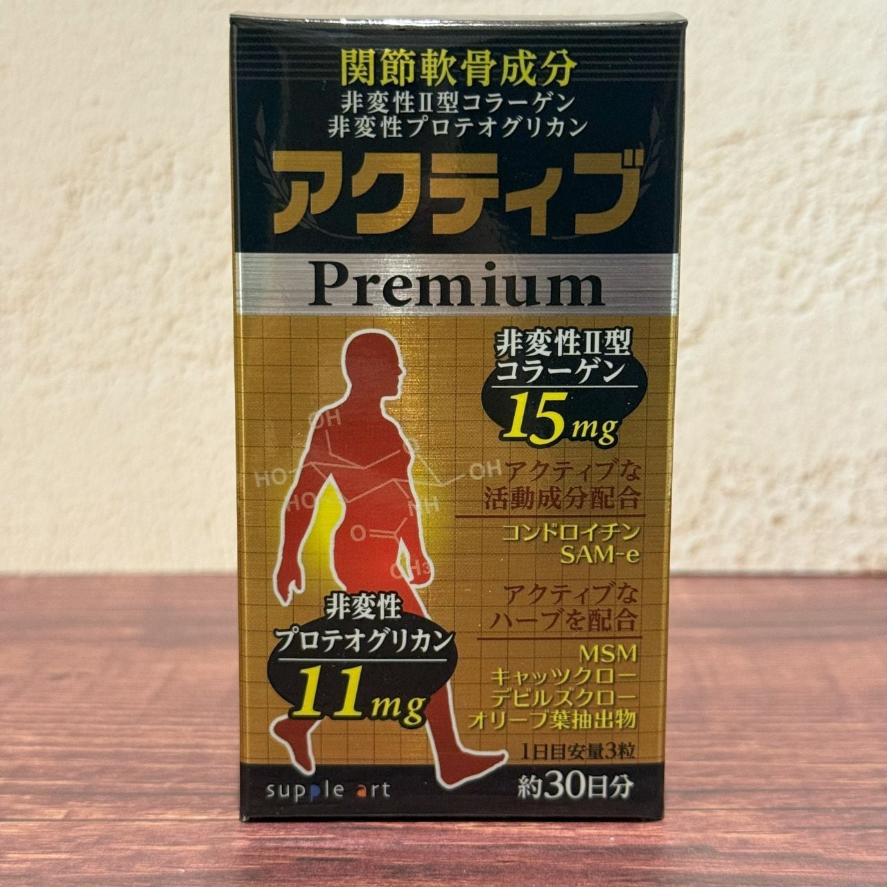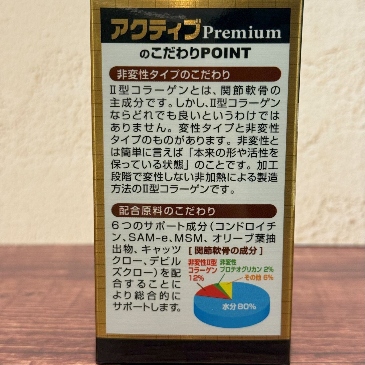 主要成分配合量:非変性II型コラーゲン 15mg、非変性プロテオグリカン 11mg、コンドロイチン含有サメ軟骨抽出物 375mg