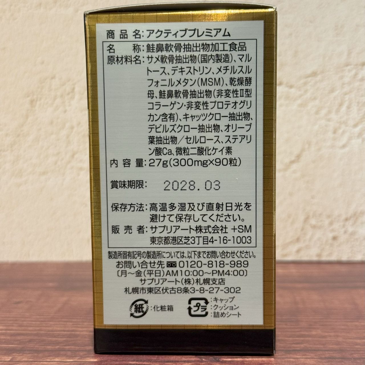 原材料:サメ軟骨抽出物、マルトース、デキストリン、メチルスルフォニルメタン(MSM)、乾燥酵母、キャッツクロー抽出物、デビルズクロー抽出物、鮭鼻軟骨抽出物(非変性II型コラーゲン含有)、オリーブ葉抽出物、セルロース、ステアリン酸Ca、微粒二酸化ケイ素