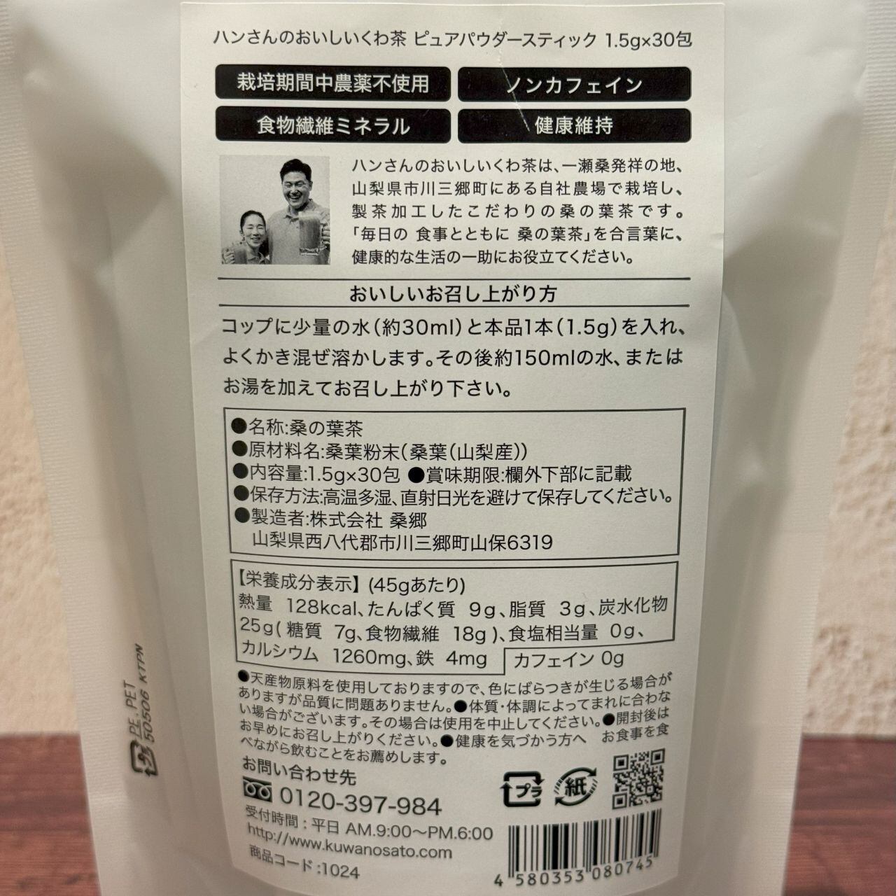山梨県市川三郷町の山間に広がる自社農園で栽培された桑の葉を100%使用しています。まろやかで甘みのあるお茶に仕上げました。